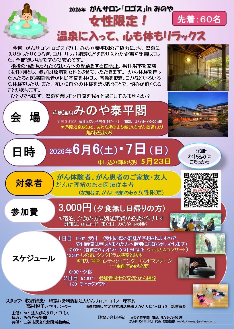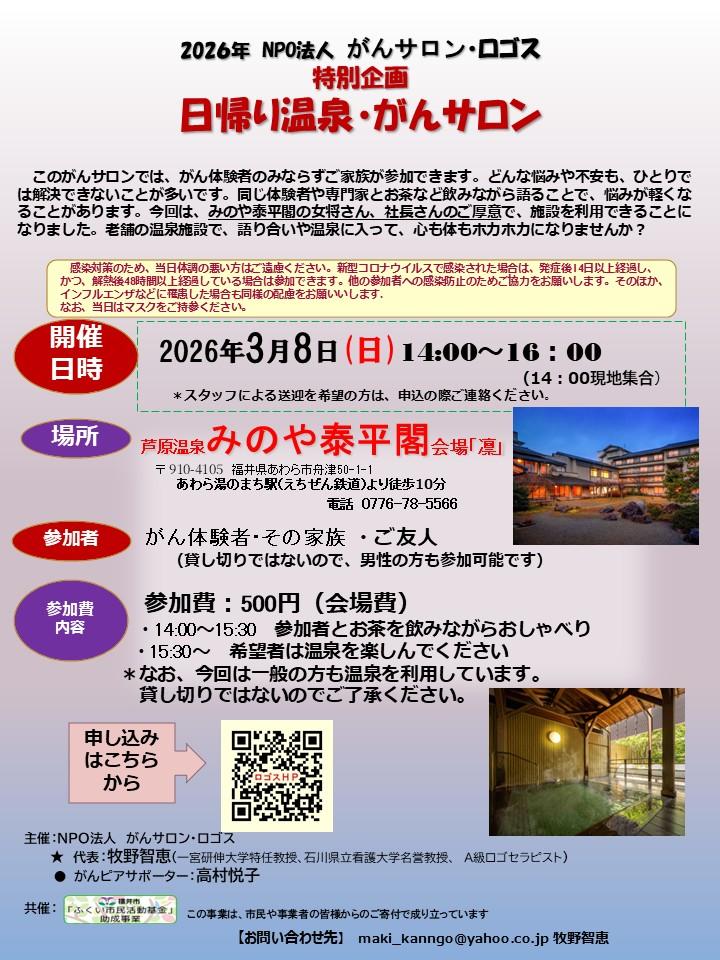 この団体は、2022年から福井市内で年間10~24回開催し、2024年・2025年度は、福井市のふくい市民活動基金助成事業の助成を受け実施し、年間200名以上が参加している。2025年度は、あわら温泉(みのや泰平閣)を貸し切り、がん患者に創を気にせず入浴できる企画を実施し、参加者が65名を超え成功に収めた。さらに、このがんサロンに参加したがん体験者が、敦賀にがんサロンの開設の動機付けとなり、2025年度からスタートした。