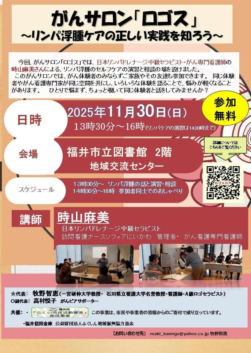 今回、がんサロン「ロゴス」では、日本リンパドレナージ中級セラピスト・がん専門看護師の時山麻美さんによる、リンパ浮腫のセルフケアの演習と相談の場を設けました。